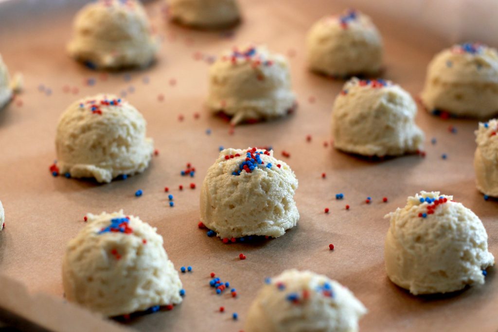 - Using a small ice cream scoop drop dough onto ungreased baking sheets. Put some sprinkles on them if you like. Bake at 160°C for 8-10 minutes or until lightly browned. Be sure not to overbake them. Remove to wire racks to cool. Enjoy!