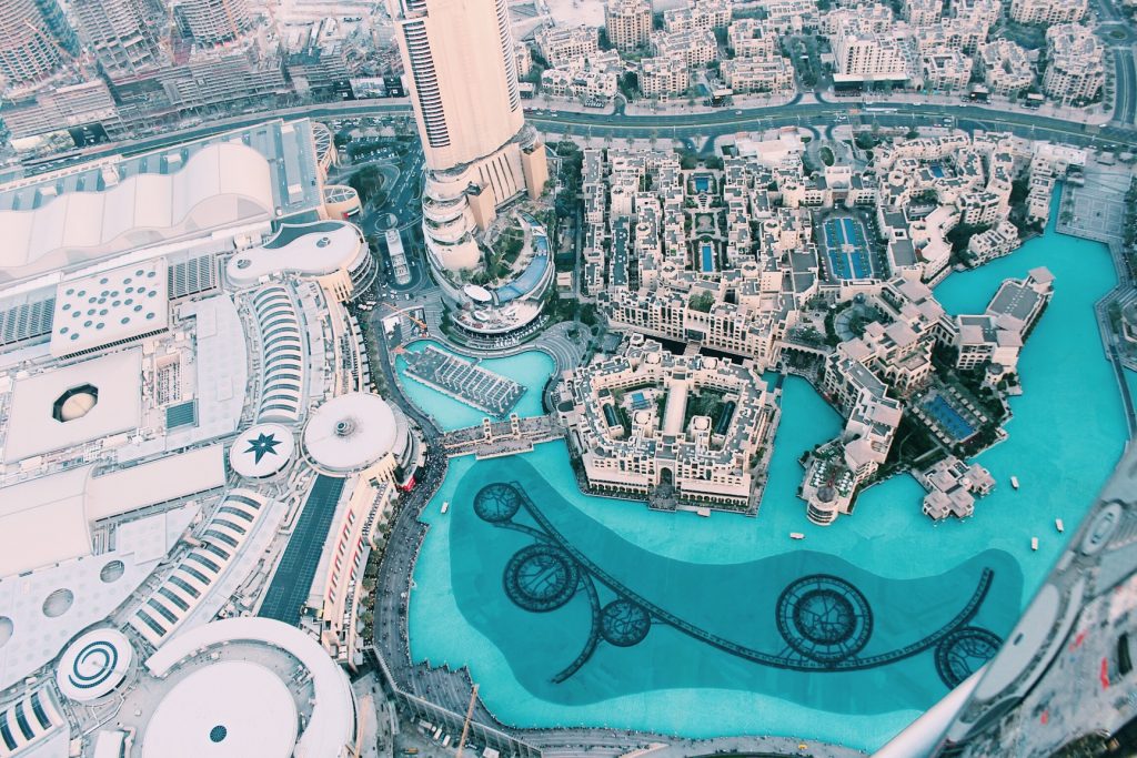 The Dubai mall and fountain seen from the Burj Khalifa