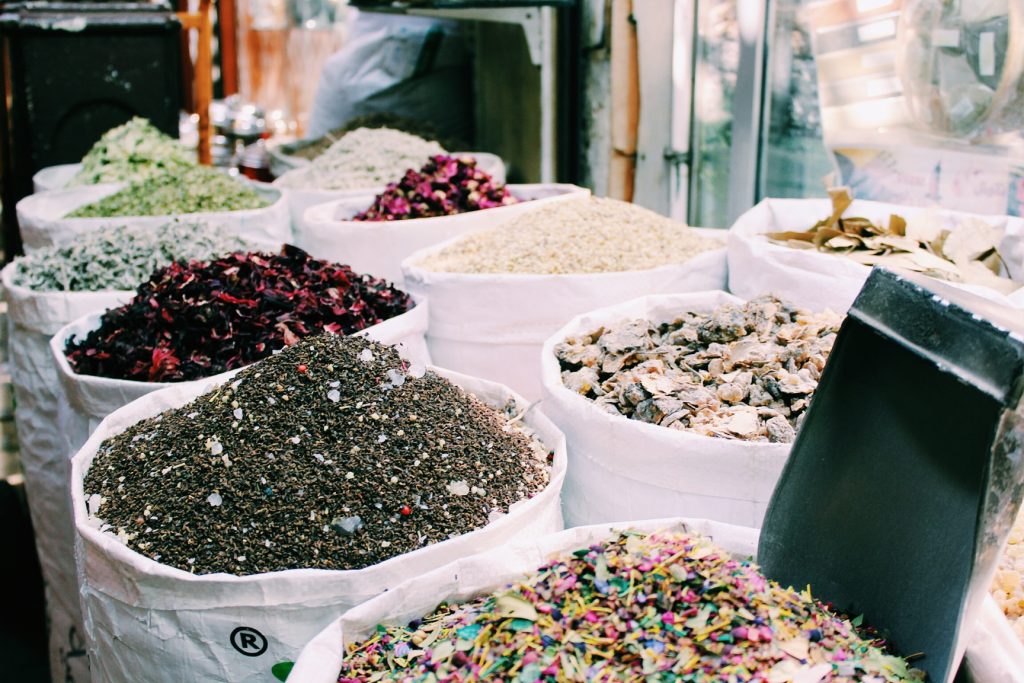 Sacks full of spices at the spice souk in Dubai